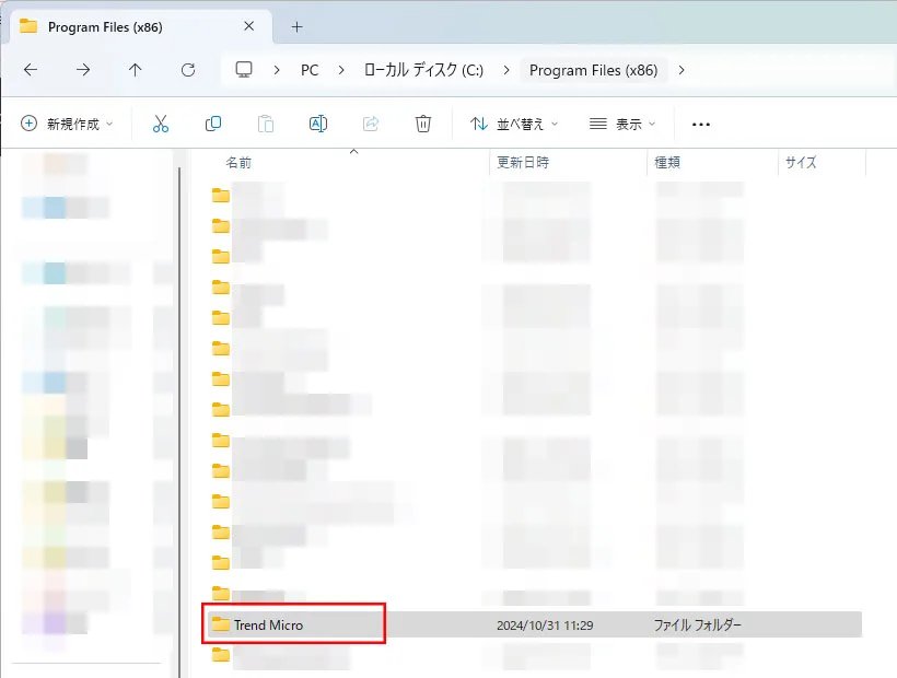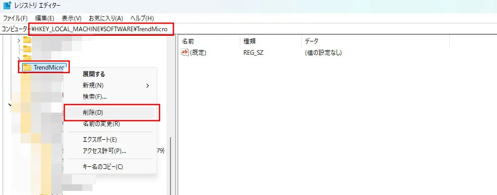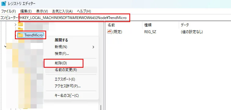 また、トレンドマイクロの複数製品をインストールしている場合は、フォルダやレジストリが該当の製品(ウイルスバスタービジネスセキュリティ)以外でも使用されているので、本手順は実施しないでください