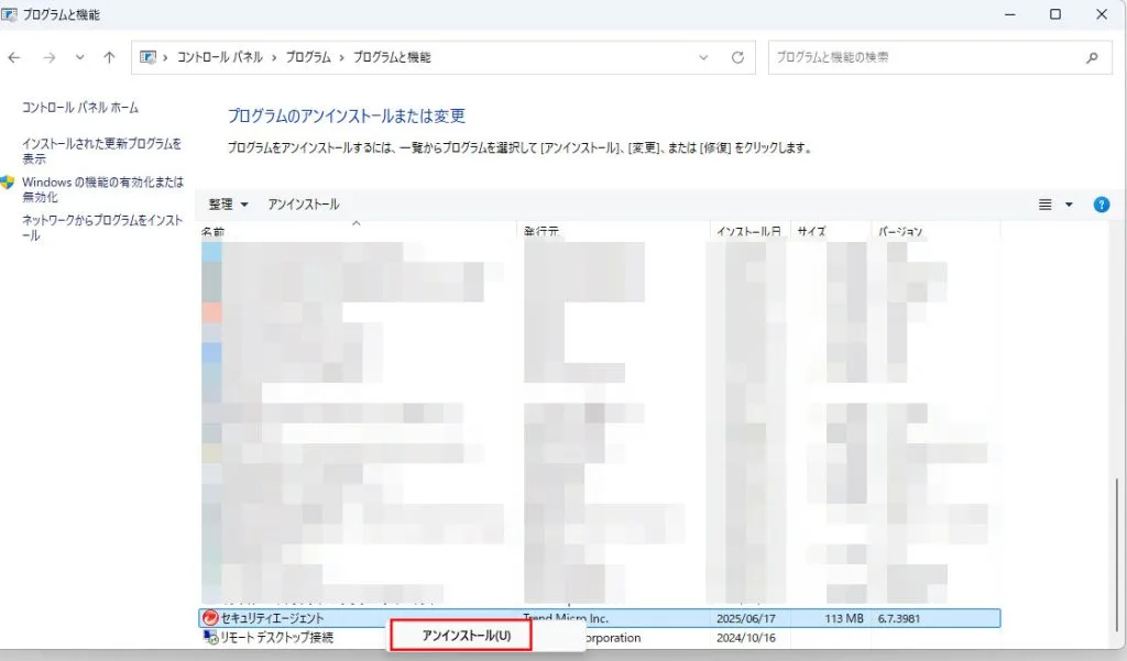 「セキュリティエージェント」を右クリックして、「アンインストール」をクリックします