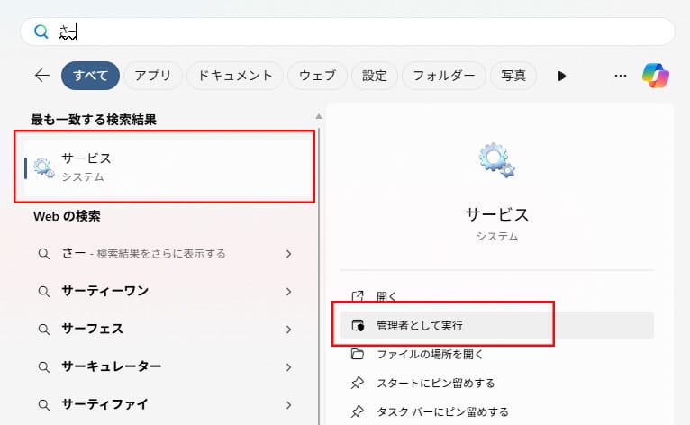 「サービス」と入力し、サービスが表示されたら「管理者として実行」をクリックします