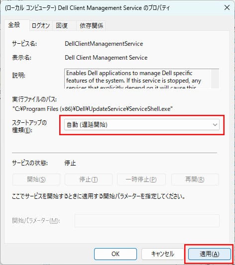 「スタートアップの種類」を「自動(遅延開始)」に変更した上で、「適用」をクリックします